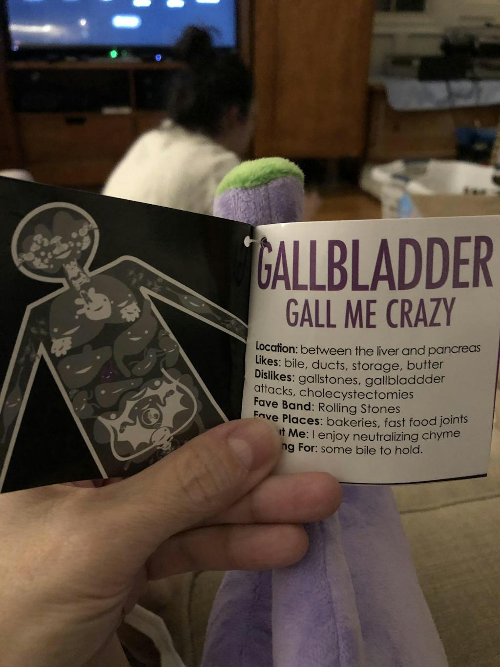 "My daughter purchased the gallbladder for her dad for Christmas because "he doesn't have one anymore." When he opened the package and saw what it was, he started laughing immediately! We all had tears from laughing!"